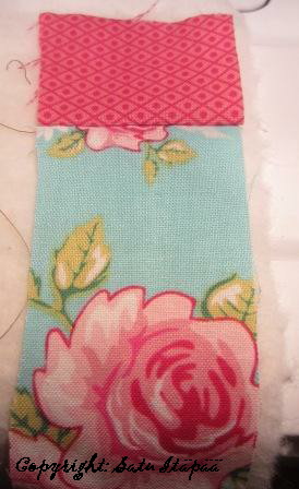 Lisätään kolmas tilkku kahden aijemman päälle ja ommellaan. Tilkut voivat olla muodoltaan aivan mitä vain: kolmioita, neliöitä, kaitaleita...